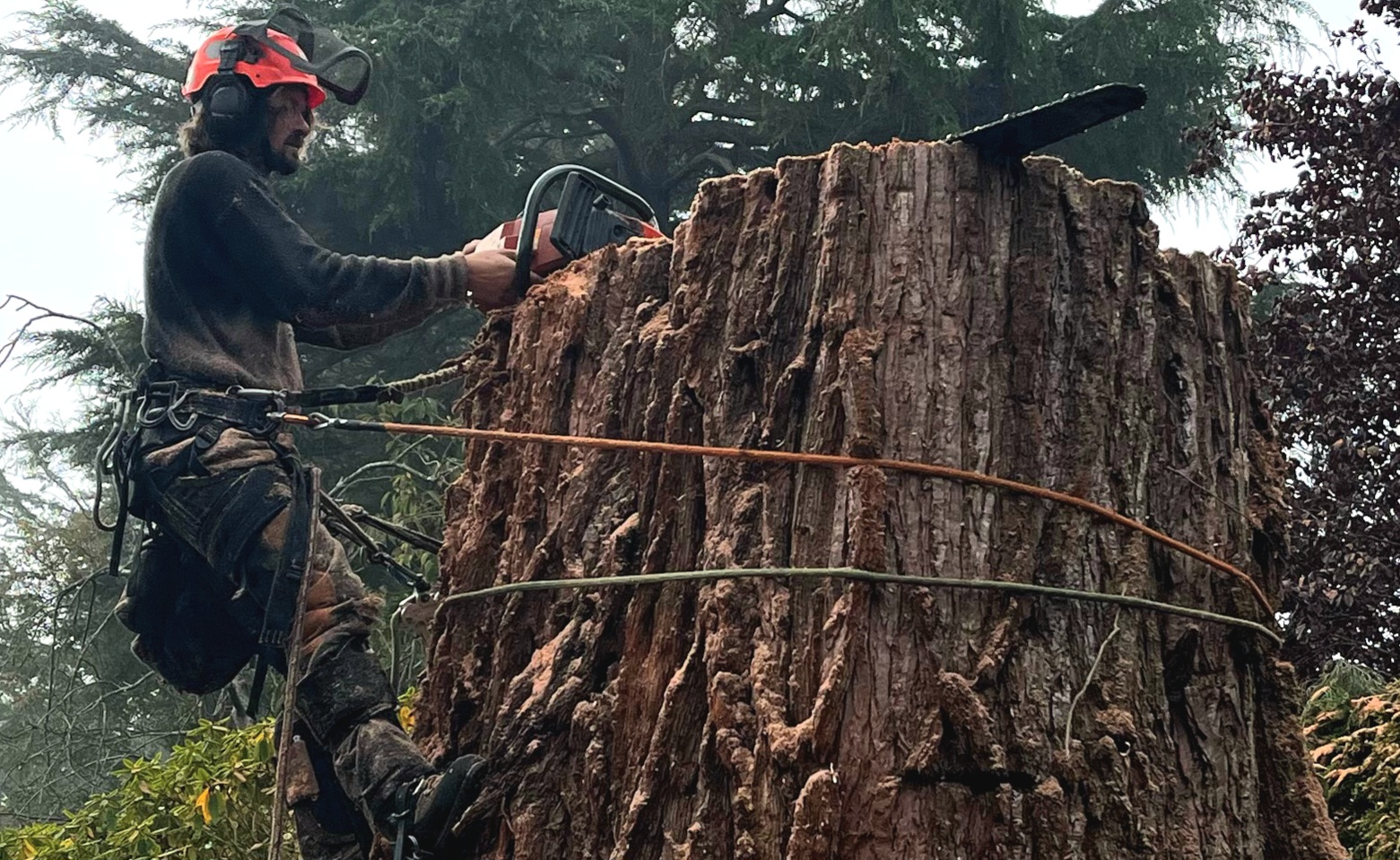 This photo was taken at a height of 20ft and shows the latter stages of a diseased Sequoia removal. With no crane access, and only a 5ft landing zone below, the stem all had to be cut into 2x2ft blocks in order to bring it down safely. It took many hours to complete, but that's what was required to ensure no damage to the wall and driveway down below